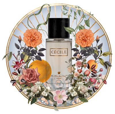 Artist Vanessa Buchmann was commissioned to create an illustration which captures the experience of wearing Cécile. Her depiction of citrus fruit, rose petals and clove buds, held inside an azure blue sky with golden rays of sun, perfectly expresses the sensation of this unique scent on warm summer skin.